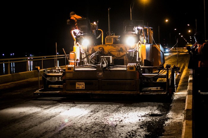 — Здесь одновременно производится два этапа: и подготовка основания под укладку асфальтобетона, и сам процесс укладки дорожного покрытия. На мосту работают 20 человек – дорожные рабочие, а также три катка и асфальтоукладчики, — рассказал руководитель подрядной организации ООО «Амурдострой». — На сегодняшний день мы провели все подготовительные работы: выравнивание, заливку трещин, снятие разрушенного асфальтобетона на тротуарах с обеих сторон моста, выполнили устройство нового покрытия тротуаров. Теперь выходим на завершающий этап — устройство асфальтобетонного покрытия проезжей части. Въезд в Благовещенск через мост — это, к сожалению, единственная дорога в город с восточного направления, и если мы будем проводить работы днем, то остановим все движение. Поэтому мы и работаем ночью, когда поток машин минимальный.