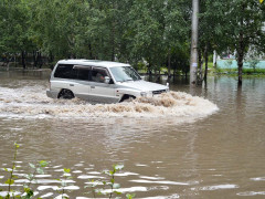 Во время сильного дождя, который пролился сегодня во второй половине дня в Благовещенске, внедорожник слетел с дороги на Мухина, напротив ТРЦ «Острова».