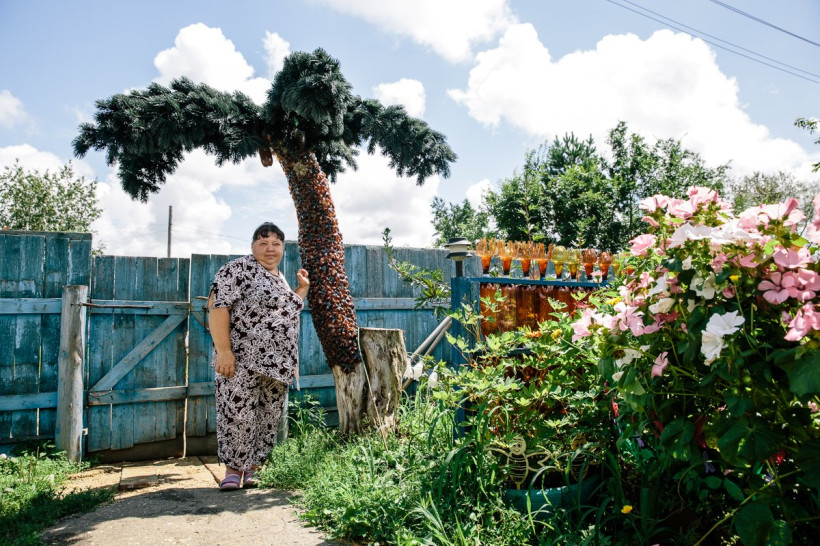 Первой во дворе Ольги Кравцовой шесть лет назад появилась пальма, которая «выросла» на месте срубленной черемухи. Сейчас ее ствол украшают донышки от бутылок, а на макушке прикреплены развесистые «лапы» от искусственной елки. Необычное деревцо круглый год радует членов семьи и согревает мыслью о жарких странах.