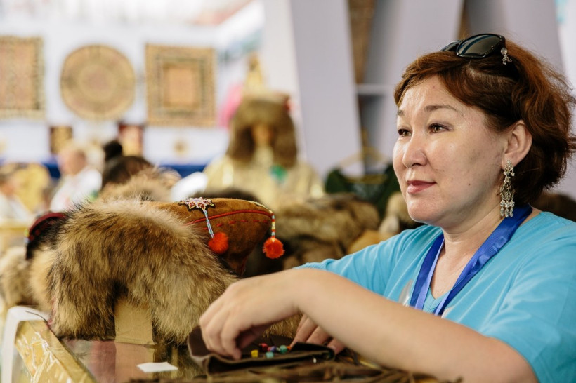 Коренная эвенка Светлана Андреева из северного Охотского района славится своими работами с мехом. На выставку она привезла национальные костюмы эвенов, а также декоративные меховые панно в виде диких птиц. Кстати, пернатая коллекция разлеталась лучше всего. К обеду на стенде оставались только изображения глухаря и лебедя. «Сова и орел уже улетели. Быстро разобрали», — пошутила автор.
