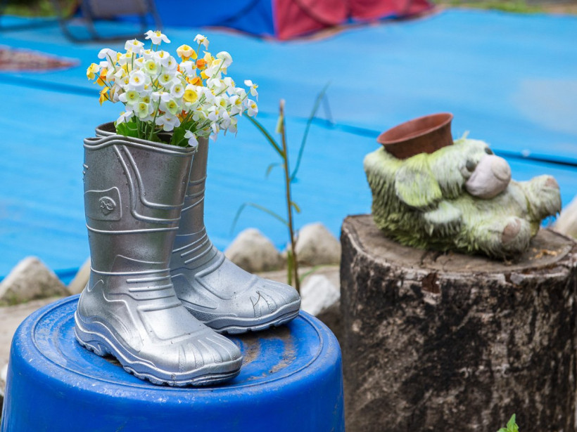 Цветы в сапогах и помидоры на клумбах украсили благовещенские дворы. Фото