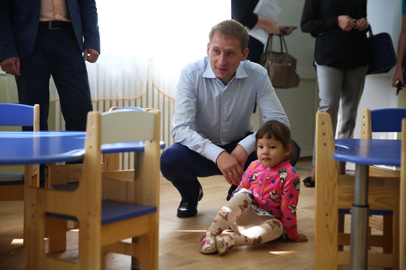 Глава Приамурья осмотрел детские площадки, на которых установлены новые горки, песочницы, деревянные паровозики и машины, а затем зашел к детям. В группе большинство воспитанников в это время играли на ковре, кроме маленького Степы, который невесело восседал за столом воспитателя.