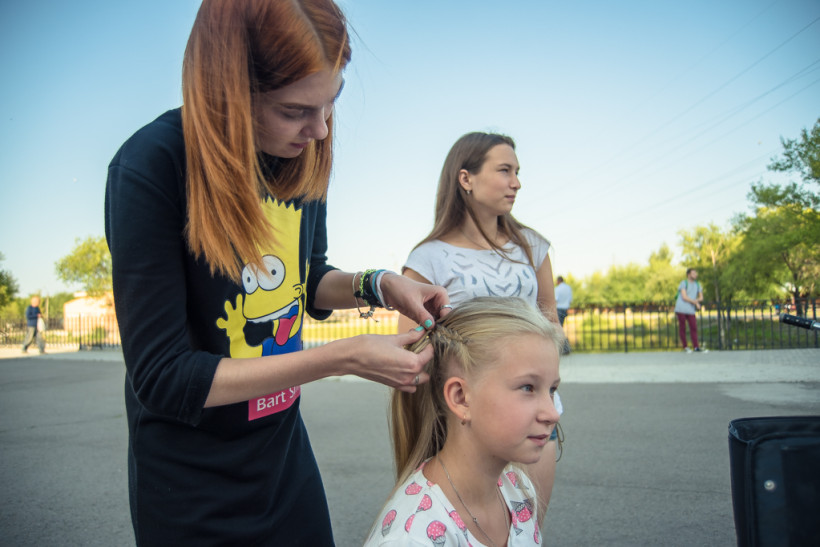 За соседним столом мастерицы из «Волшебной расчески» учили делать маленьких модниц прически в школу.