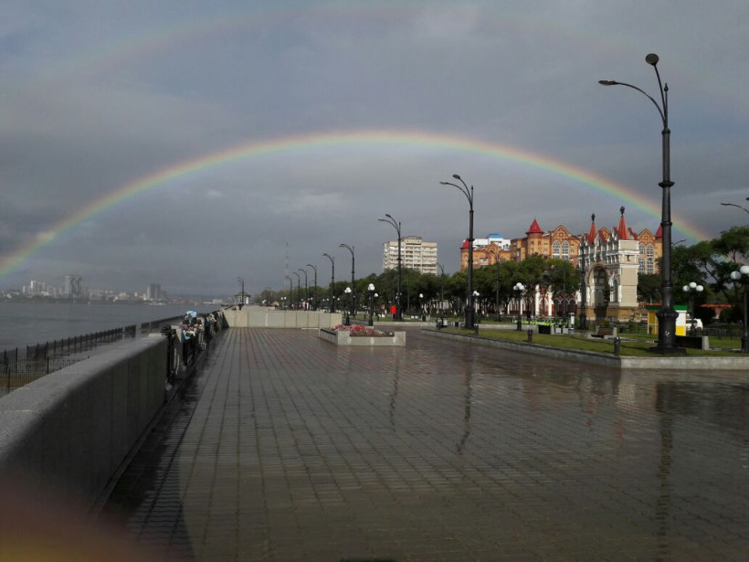 1 сентября утром в Благовещенске прошел дождь, а потом из-за туч выглянуло солнце. Полная радуга раскинулась над городом и хорошо была видна в районе набережной. Некоторые горожане посчитали это своеобразным подарком ко Дню знаний, а кто-то вспомнил про завтрашнюю дату — 2 сентября, день окончания Второй мировой войны. К слову, сегодня городу снова обещают дожди и местами сильные. Из-за этого школьные линейки могут перенести в помещения. Такой же прогноз дают синоптики и на ближайшие дни — в пятницу местами по области, в южной и центральной части, пройдут сильные дожди. С субботы, 3 сентября, немного прояснится, но иногда тучи будут прорываться осадками — от слабых до умеренных. При этом будет тепло — до +25 градусов днем.
