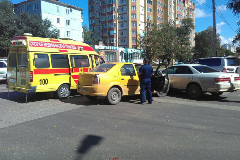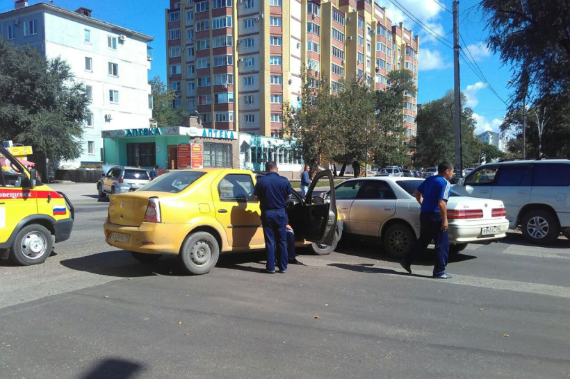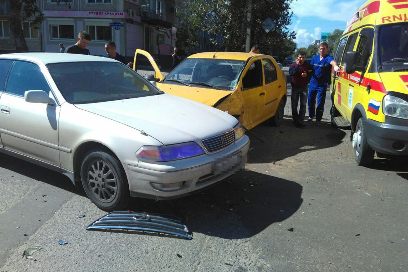В Благовещенске внедорожник «Лексус» GX 470 на большой скорости попытался проскочить перекресток Политехнической — Амурской. Совершить маневр джипу помешал автомобиль такси, который двигался по главной дороге. От удара желтый Renault Logan отбросило на Toyota Mark II, а самому таксисту потребовалась помощь медиков.