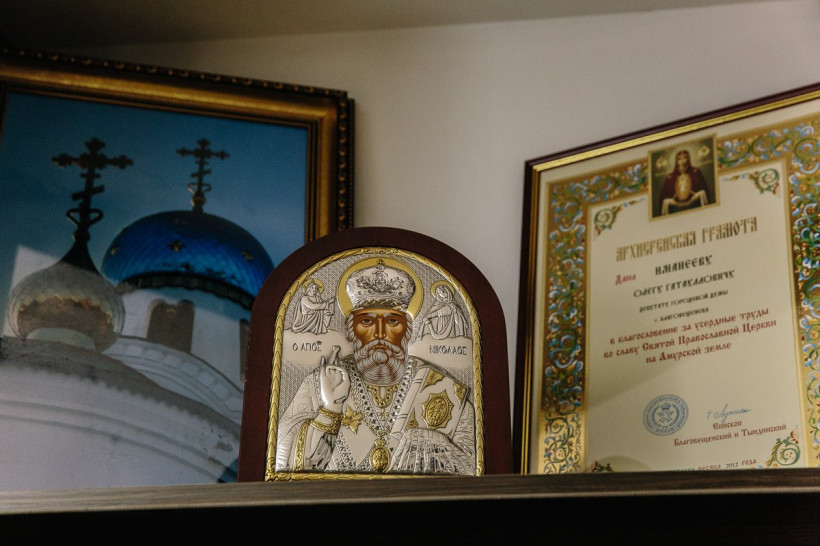 И десятки фотографий на стенах. Причем не постановочных фото, а реальных моментов из жизни: младший сын через несколько часов после рождения, друзья, весело танцующие на праздновании Нового года, подписание строительного договора с арабским шейхом, совещание в гордуме Благовещенска и многое другое. «Фото в альбомах видят несколько раз в год. А у меня всегда перед глазами семья, друзья, коллеги, важные и дорогие люди, — объясняет Олег Имамеев. — Что буду делать с новыми фотографиями, когда стена закончится? Просто начну вешать их на другую стену».