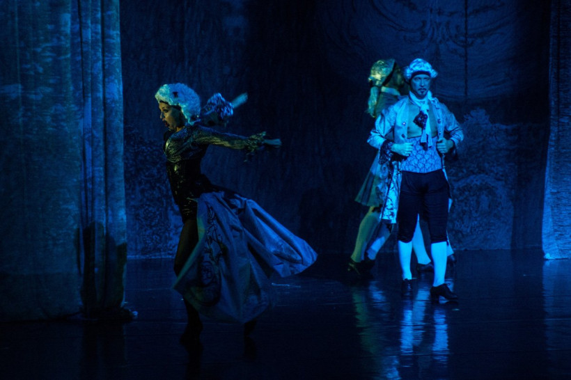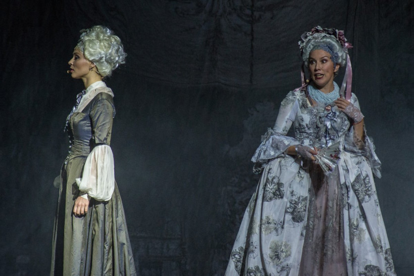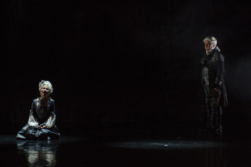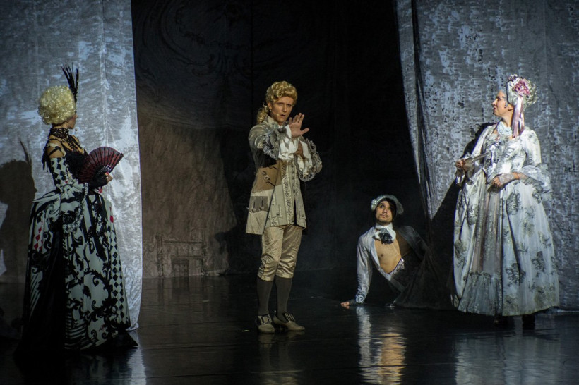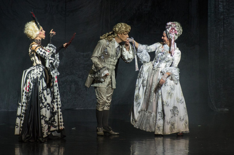 За серой материей прячутся герои, напоминая популярную графическую технику «силуэт». Когда страсти накаляются до предела, в шахматную расцветку вкрапляется красный. Он усиливает чувства, символизирует кровь. Режиссёр Балуев нашел много своих находок в игре с тканью. К примеру, в сцене, где мадам де Турвель сходит с ума, из ее платья вытягиваются многометровые рукава. Они развеваются по сцене, как не сбывшиеся мечты и надежды, ими стягивают несчастную женщину.