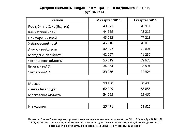 На втором месте по Дальнему Востоку оказалось Приморье — 48 532 рубля за «квадрат». На 11 рублей дешевле по расчетам ведомства, стоит метр жилья в Якутии. Республика Саха стала третьей (48 521 рубль за кв. м). Самое дешевое жилье можно найти в Чукотском автономном округе, где средняя цена одного квадратного метра на четвертый квартал едва превышает 33 тысячи рублей.