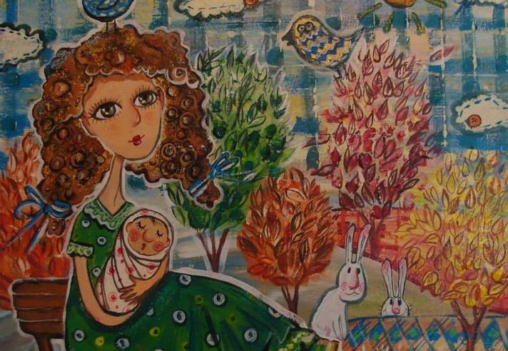 В подборку картин о материнстве включили работы канадки Кэти Берггрен, украинской художницы и многодетной матери Мирты Гроффман, американки Холли Сьерра, австралийки Нериды де Йонг, а также двух художников-мужчин: итальянца Пино Даени и китайского живописца Иханг Пэн. У каждого из авторов свой взгляд на беременность и материнство. Амурчанка Анна Тюрина рисует жизнь молодых мам в стиле наивной живописи. В прошлом году в Благовещенске прошла ее выставка картин «Пеленки-распашонки».