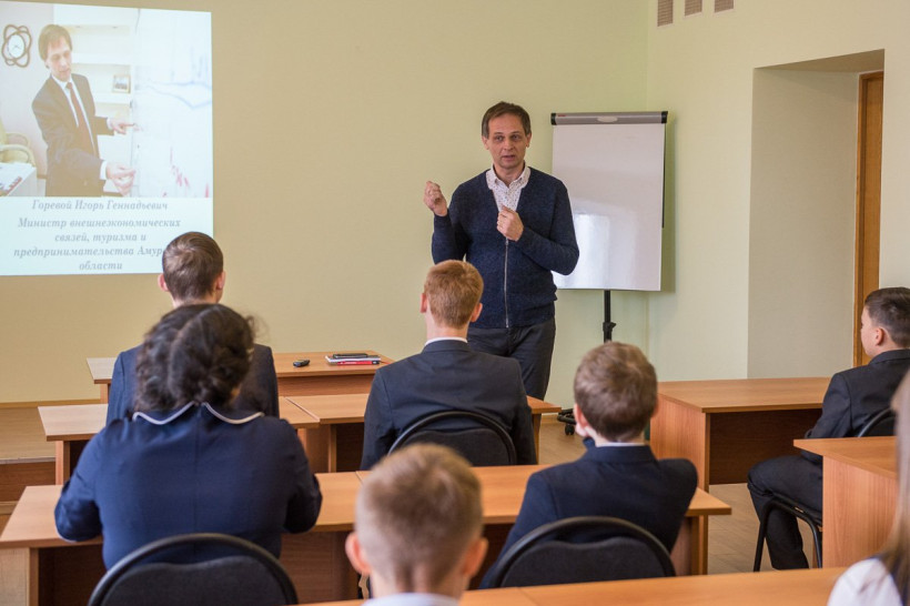 Встреча школьников и министра внешнеэкономических связей, туризма и предпринимательства Игоря Горевого прошла сегодня, 14 октября, в лицее АмГУ в рамках нашей рубрики «Классный час». Правда, отвечать на непростые вопросы пришлось не только Игорю Геннадьевичу, но и самим лицеистам. Что такое патриотизм, сколько тысяч километров от Земли до Луны и какие книги читает молодежь — ребята с достоинством выдержали небольшой экзамен от министра.