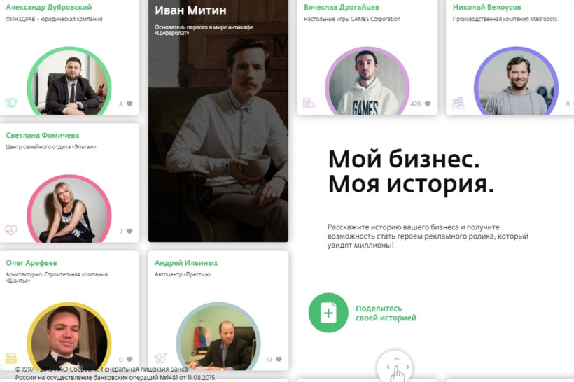 Сбербанк запустил проект «Мой бизнес», который дает предпринимателям возможность стать героями рекламного ролика. Для этого им нужно заполнить анкету на сайте банка и рассказать историю своего успеха. Сейчас уже опубликованы истории нескольких десятков представителей малого бизнеса со всей страны.
