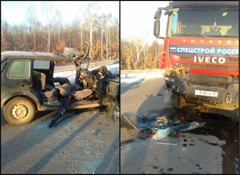 Автомобильная авария произошла сегодня ночью на федеральной трассе в районе города Циолковского. Около трех часов ночи «Нива» на большой скорости врезалась в стоявший грузовик IVECO, принадлежащий Cпeцcтpoю России и работавший нa космодроме. Удар был такой силы, что отечественную легковушку смяло.