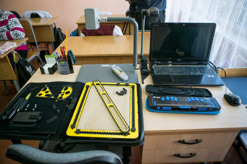 В помощь специалистам в школе имеется профессиональное оборудование, предназначенное для особенных учеников. Для слабослышащих ребят это звукоусилитель, для слабовидящих — читающее устройство, способное озвучивать текст из учебника или с доски. Есть и универсальный световой планшет, который можно подключать к компьютеру и проектировать на нем любые объекты, включая здания.