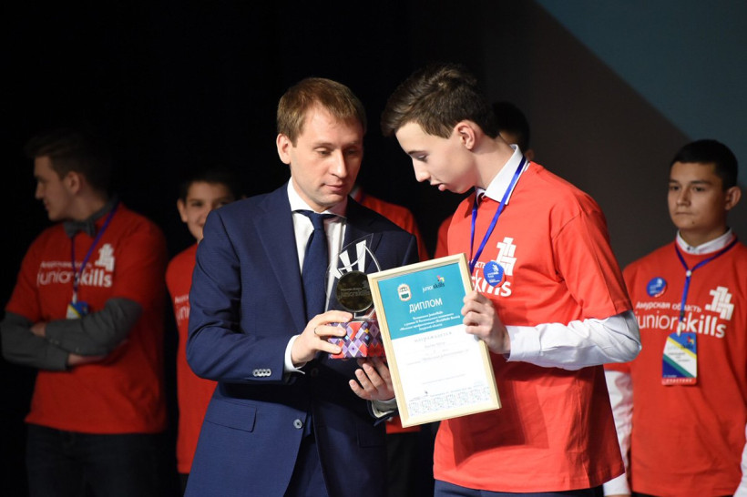 В этом году впервые в Приамурье в рамках регионального чемпионата провели соревнования для школьников JuniorSkills. В них поучаствовали амурчане в возрасте от 8 до 14 лет. Из рук губернатора они получили сегодня дипломы. В младшей возрастной группе в компетенции «Мобильная робототехника» выиграли Денис Брюханов и Даниил Кононыхин. В старшей группе в той же компетенции лучшими стали Матвей Плевако и Артур Бахтин. Также дипломы победителей вручили представителям старшей возрастной группе в компетенции «Электромонтажные работы» — Вадиму Козюре и Александру Брюханову.