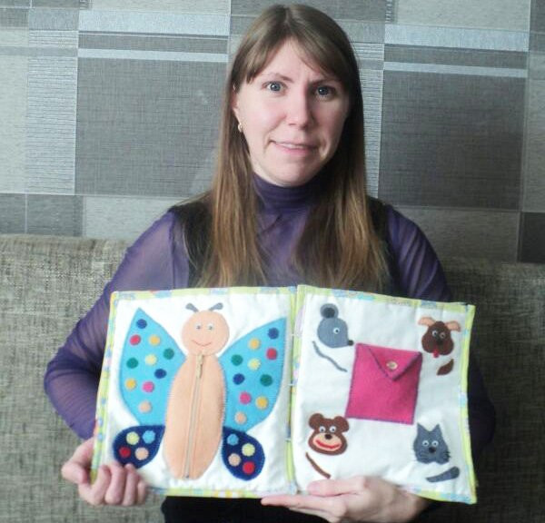 — Не так давно в социальных сетях люди стали выкладывать всякие занимательные штуки для деток: то дедушка сделал щит, на котором звоночки, выключатели, тумблеры, щеколды, чтобы внучок учился мыслить и мог делать простейшие бытовые операции сам. Меня заинтересовал мягкий аналог: на куске ткани всякие штуки интерактивные сделаны. Подумала — решила сделать своему малышу целую книжку. Странички в ней — разные. Там и пуговички с петельками из фетра, для того чтобы малыш учился их застегивать. Есть «крестики-нолики» на липучках. На других разворотах — кораблик, передвигающийся «по волнам», пирамидка с частями разных цветов и размеров, геометрические фигуры, которые нужно прикрепить на основную страницу, к их «силуэту» из светлого фетра. Кроме того, в моей книжке «поселилась» азбука с крупными цветными буквами, цифры, часы со стрелочками, подобие счет из крупных бусинок на тесьме. Один из самых интересных разворотов, на мой взгляд, «кормушка» для животных. Я расположила в разных углах листа собаку, кошку, обезьяну и мышку, а в конвертик в центре на ниточки приделала сыр, косточку, банан и рыбку — все из цветного войлока. У сына был восторг, когда он каждое животное кормил «правильной едой».