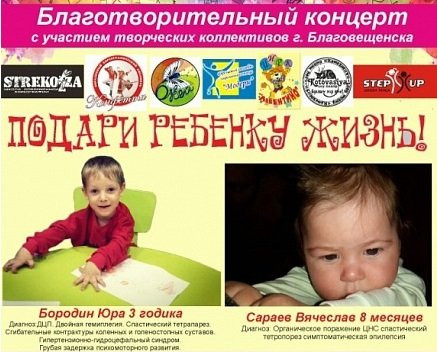 7 декабря в Амурской областной филармонии пройдет благотворительный концерт известных творческих коллективов Благовещенска. Средства собирают двум маленьким жителям амурской столицы с врожденными недугами.