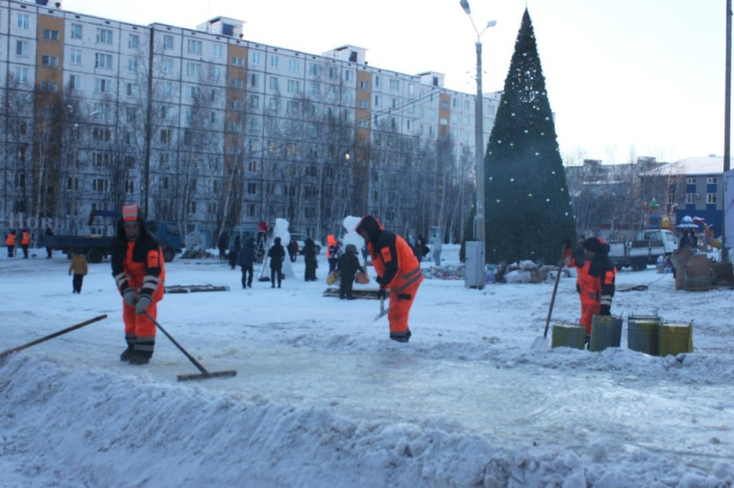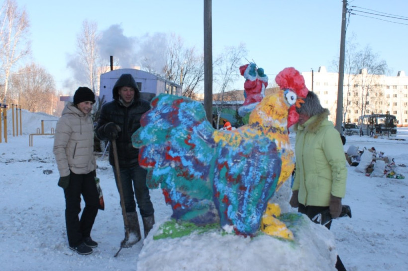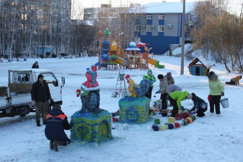 У главной новогодней красавицы Тынды выгрузили около тысячи цветных ледяных кирпичиков, которые заранее заготовили горожане. Одни украшали зеленый заборчик из сосен игрушками, изготовленными школьниками и воспитанниками детских садов. Мастера Кузнецовы вырезали снежные фигуры Деда Мороза и Снегурочки. Представители коммунальных служб продолжали создавать горки для детворы и взрослых. В итоге около главной елки появились цветные лабиринты, ледяные елочки, аквариум, цветы, гусеница и черепаха. Раскрыли свой талант скульпторов педагоги из Центра детского творчества и родители детсада «Черемушки». Из снега они слепили символ грядущего года – яркого красочного петуха, а также пастушка, играющего на дудочке.
