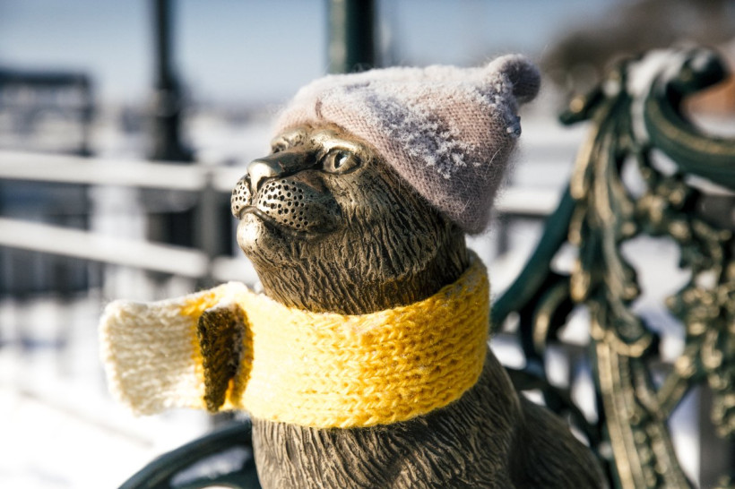 Для бронзового кота связали розовую шапочку с помпоном и желтый шарф. Горло сидящей рядом на лавочке сороки укутали модным шарфом-снудом. Впервые заботливые горожане утеплили скульптурных героев прошлой зимой. Правда сорока быстро лишилась вязаного чепчика, но невозмутимого кота шерстяной шарф украшал до наступления тепла.