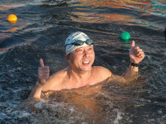 В первый понедельник нового года в столице Приамурья прошла традиционная российско-китайская рождественская эстафета. Соревнования спортсмены провели в проруби на реке Зея. В ледяную воду по очереди нырнули 60 китайских и 20 амурских моржей. Серьезность соревновательного момента разбавили шуточными представлениями. На зимнем мероприятии побывал фотокорреспондент АП Андрей Ильинский.