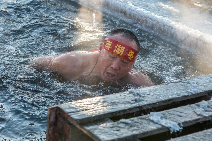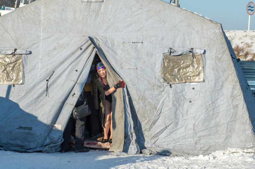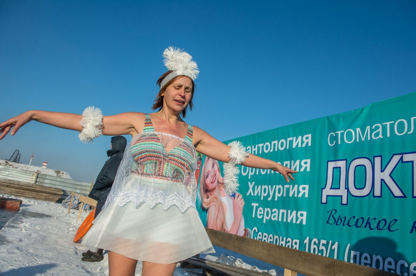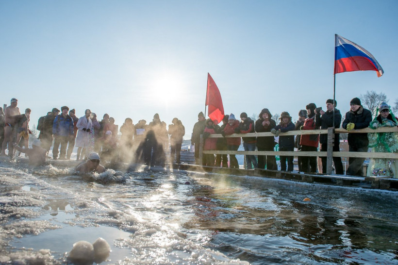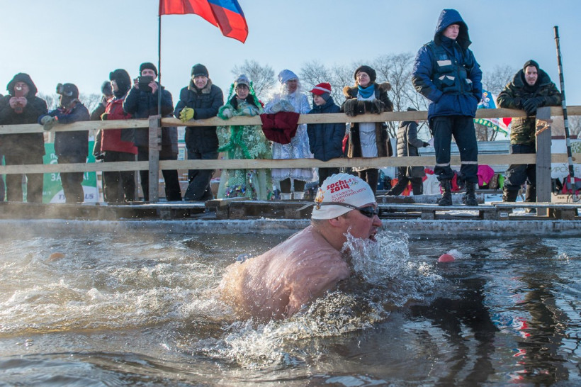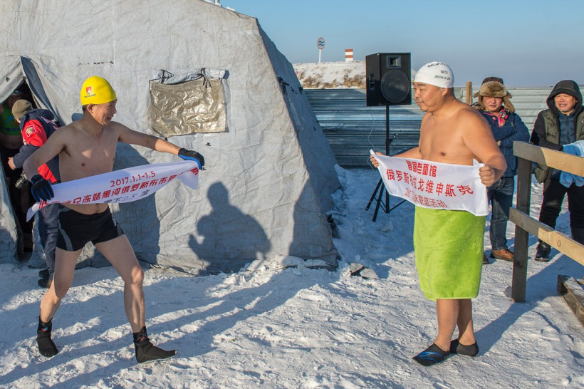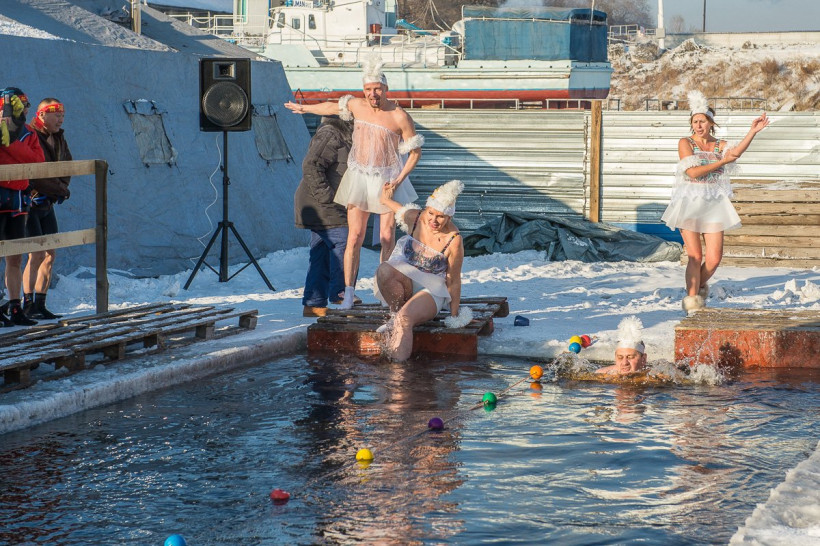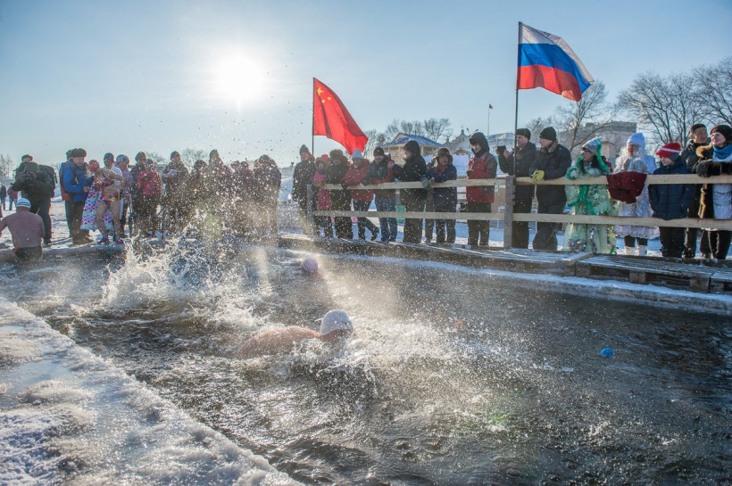 В первый понедельник нового года в столице Приамурья прошла традиционная российско-китайская рождественская эстафета. Соревнования спортсмены провели в проруби на реке Зея. В ледяную воду по очереди нырнули 60 китайских и 20 амурских моржей. Серьезность соревновательного момента разбавили шуточными представлениями. На зимнем мероприятии побывал фотокорреспондент АП Андрей Ильинский.