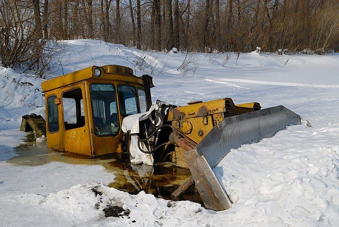 Бульдозер с машинистом провалился под лед в карьере Покровского рудника