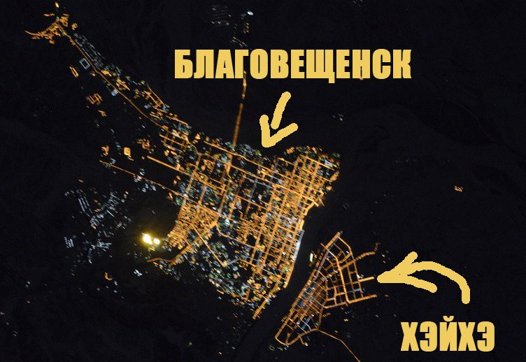 И, похоже, жители областного центра Приамурья и сами потихоньку начали верить в «китайский Лас-Вегас». Во всяком случае, такой вывод можно сделать по реакции некоторых интернет-пользователей на ночные фотографии Благовещенска и Хэйхэ, которые сделал российский космонавт. На них китайский город оказался в четыре раза меньше Благовещенска. С такой реальностью захотели мириться немногие.