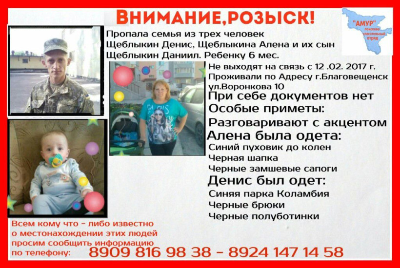 — Денис и Алена бежали из Украины более полугода назад, российских паспортов у них пока нет. Мы помогали им перебраться в Благовещенск. Даниил родился уже здесь, — пояснила Елена Злобина. — Они снимали квартиру на Воронкова, 10. Но хотели найти жилье подешевле, искали квартиру, собирались пойти расклеивать объявления. 12 февраля перестали выходить на связь. В съемной квартире все вещи на месте, даже кофе остался на столе. Но больше их никто не видел. Родственников у них здесь нет.