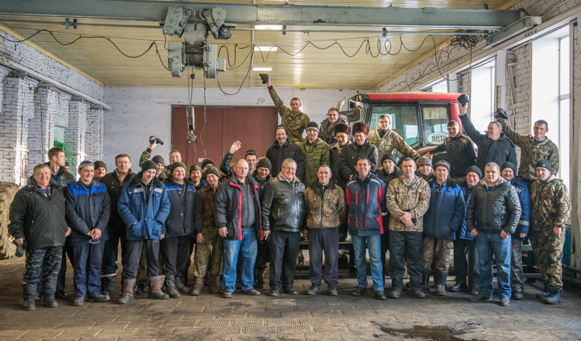 Через полчаса начнется совещание — нам надо успеть поговорить и вместить в общий снимок почти 50 человек! «В ремонтных мастерских работают в основном механизаторы, а механизаторы у нас все хорошие», — отметила диспетчер Татьяна Войчайтес, которая стала нашим гидом по мужскому маршруту.