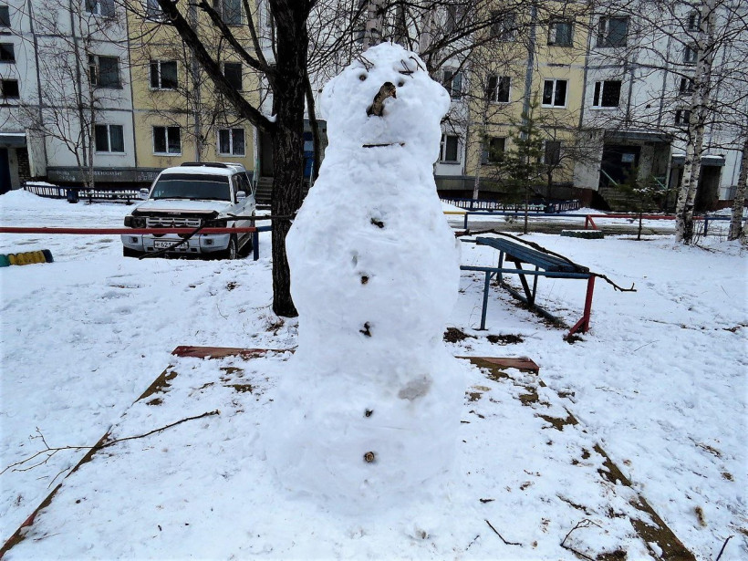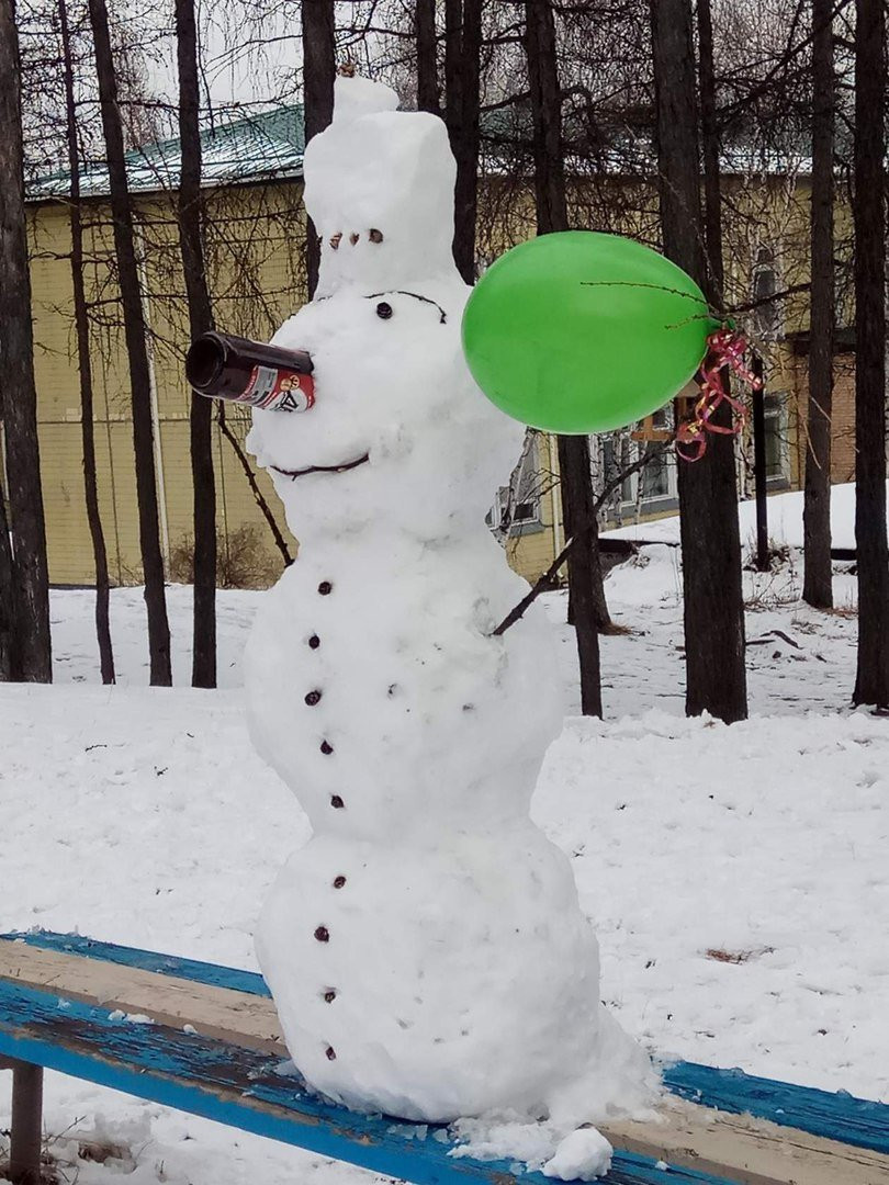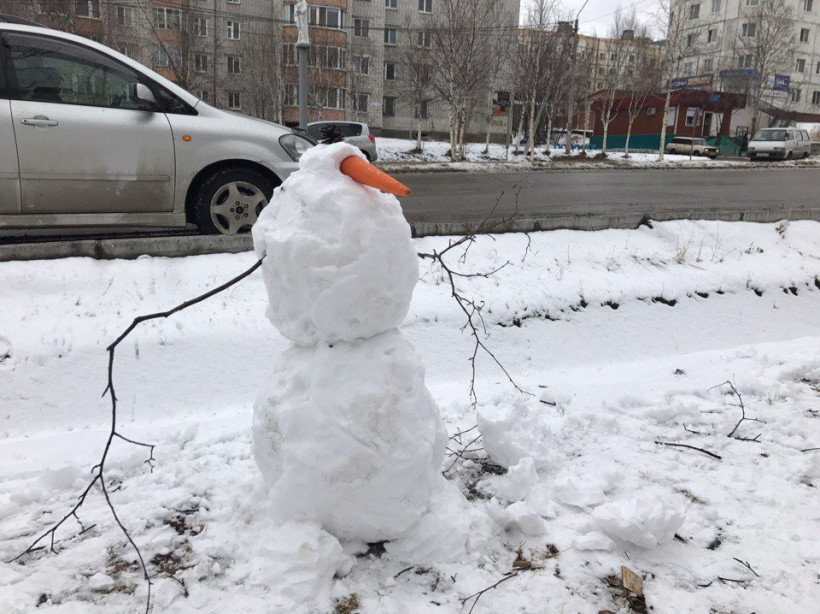 Для жителей Тынды снегопад в середине апреля уже давно не является новостью. Такие осадки на севере Приамурья будут продолжаться до мая. В социальных сетях тындинцы активно делятся фотографиями снеговиков, которые буквально захватили столицу БАМа. Снежные фигуры появились не только во дворах многоэтажек, но и у здания местного отдела полиции, у подножия городской Доски почета. Большую фантазию «мастера» проявили при выборе материалов для частей тела снеговиков — морковь, ветки деревьев, шишки и даже пустая бутылка.