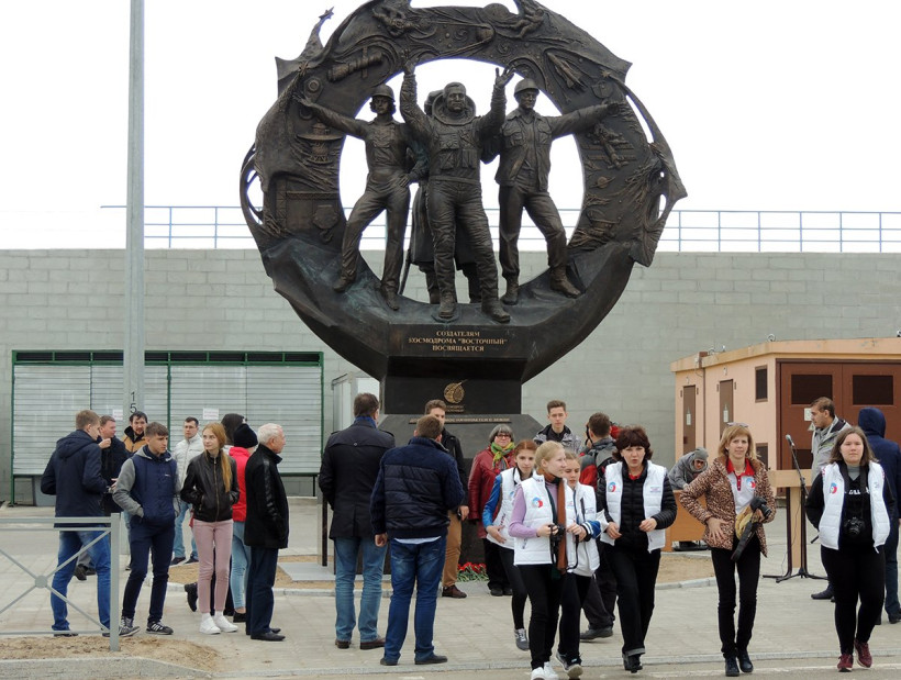 Праздник начался в космической гавани Приамурья городе Циолковском с возложения цветов к памятнику строителей Восточного. Сам монумент был установлен в августе прошлого года. Шестиметровая композиция символизирует земной шар, внутри которого находятся фигуры, изображающие космонавта, строителя и хрупкую девушку-инженера, усилиями которых и создан космодром. С обратной стороны — казак-первопроходец, как дань уважения людям, которые основали первые поселения на Амуре. Девиз композиции — «Дорога в космос начинается с земли».