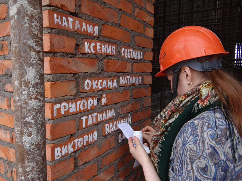 Внутри храма установлена винтовая лестница. А строительными «лесами», которые здесь находятся, можно было бы закрыть фасад дома высотой в 9 этажей и длиной в три-четыре подъезда, сообщается на сайте Благовещенской епархии. Еще одно изменение коснулась стен храма. На кирпичи с северной стороны будущей церкви художественными кисточками и акриловой краской нанесли имена жертвователей — всех, кто решил внести свой вклад в масштабную стройку.