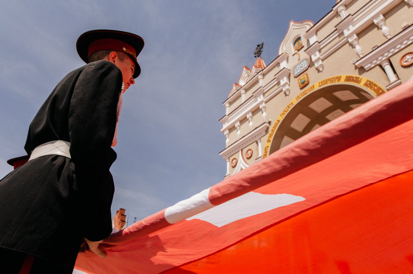 Колонны тронулись от площади возле Общественно-культурного центра в 11:30, после окончания шествий войск. Около 40 минут потребовалось участникам, чтобы дойти до площади Победы, где состоялось возложение цветов.
