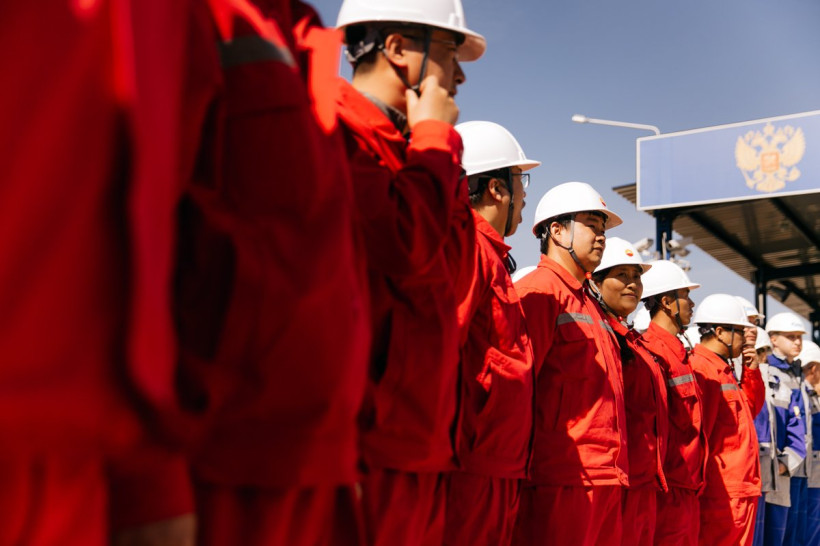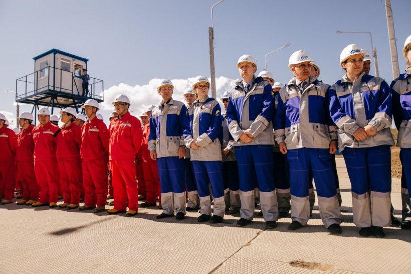 После осмотра территории гости выступили перед работниками. Их встречали выстроившиеся стройными рядами строители-китайцы в красных робах CNPC и российские газовики в форменной сине-белой одежде Газпрома. Оба представителя газовых корпораций России и КНР свою речь начали с благодарности губернатору за солнечную и теплую погоду, которая встретила их в Амурской области, несмотря на обещанные дожди.