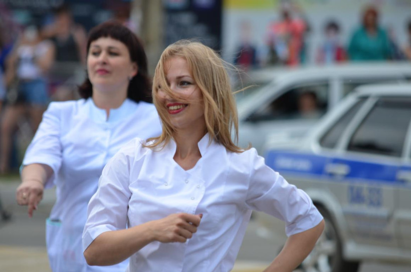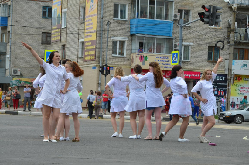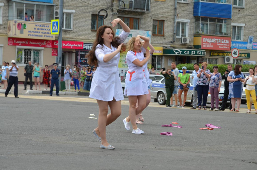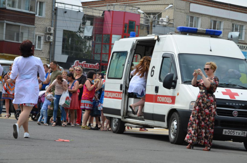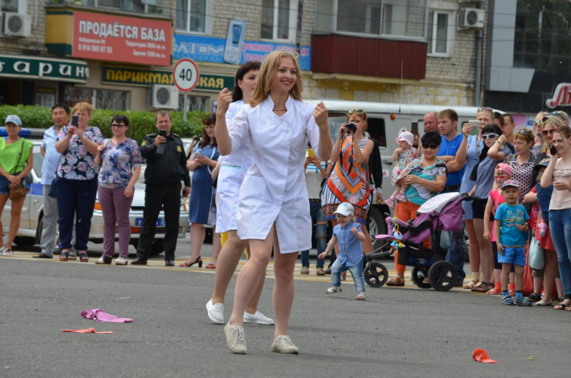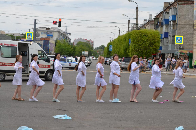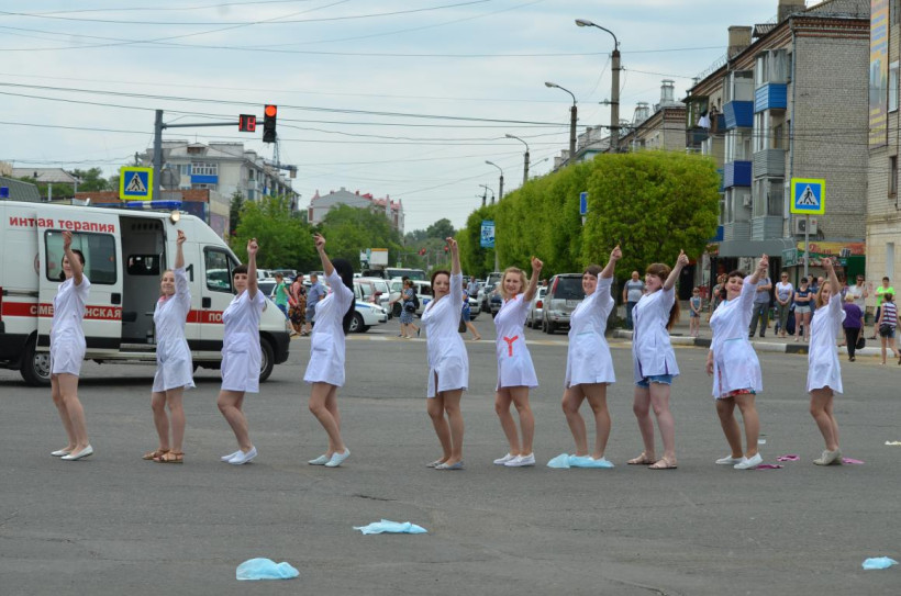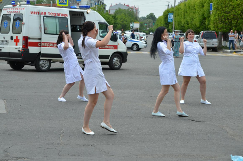 — Традиционно мы проводим торжественное собрание по этому случаю и каждый год хотим по-особенному отметить профессиональный день. В 2017 году решились на танец в оживленной части города, — рассказал главврач городской больницы, депутат амурского Заксобрания Андрей Рудь. — Готовились к нему в нерабочее время, основательно. Наши медработники разучили танец, в композиции задействовали два автомобиля скорой помощи.