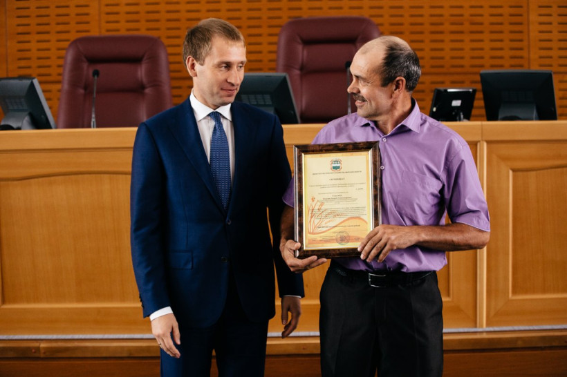 Обычно в полуденный зной Дмитрий Жариков на полевых работах — в личном подсобном хозяйстве пять голов скота, соей засеяны 30 гектаров. Почти всю жизнь житель Чеснокова в Михайловском районе отдал сельскому хозяйству, работал машинистом на зерновом дворе. Только этой весной семья взяла дальневосточный гектар, чтобы развивать собственную ферму. И вот наконец селянину пригодилась парадная рубашка. Вместе с супругой Дмитрий Анатольевич отправился в амурскую столицу получать грант из рук губернатора.