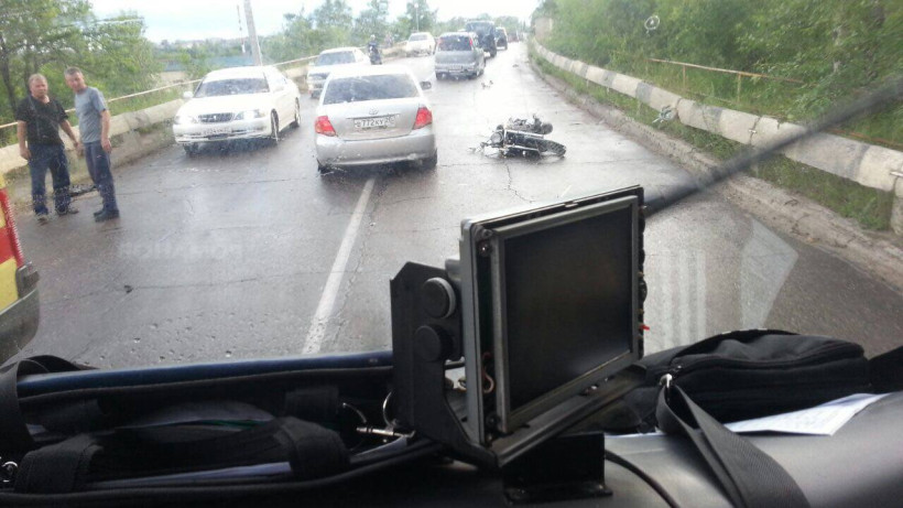 Очевидцы происшествия сообщили, что мотоцикл врезался в иномарку в районе виадука. В результате столкновения двухколесный транспорт отбросило в сторону, а у машины вырвало переднее колесо. Официальных данных о происшествии и пострадавших в аварии пока не поступало.