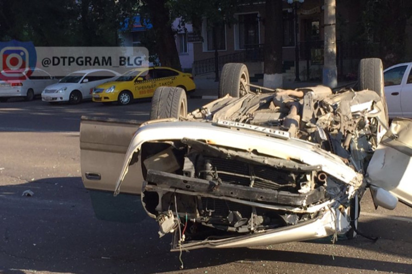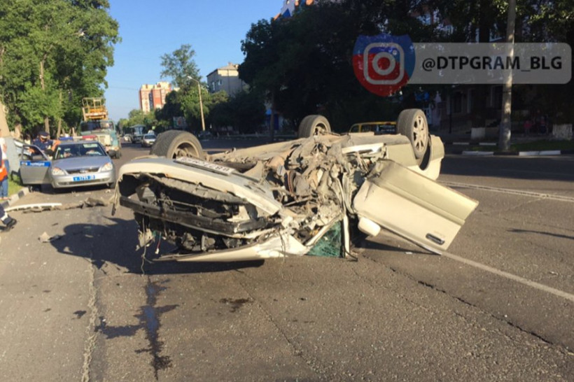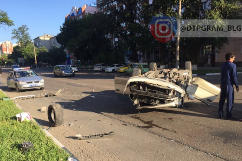 В Благовещенске иномарка врезалась в опору, потеряла колесо и перевернулась на крышу (видео)