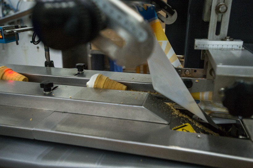 По конвейеру беспрерывным потоком едут пустые вафельные стаканчики, их бойко расставляет оператор, а затем они из автомата наполняются нежнейшей белой смесью. В коробке около ста форм, она пустеет в ловких руках девушки за 1,5—2 минуты.