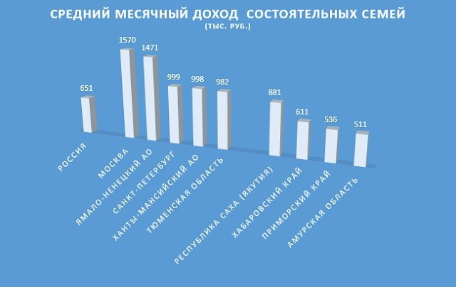 В среднем по России доход состоятельных семей оценивается в 650 тысяч рублей. Регионы лидеры по этому показателю — это Москва (1 миллион 570 тысяч рублей), Ямало-Ненецкий автономный округ (1 миллион 471 тысяча рублей) и Санкт-Петербург (999 тысяч рублей). В топ-5 субъектов с богачами вошли также Ханты-Мансийский АО и Тюменская область.