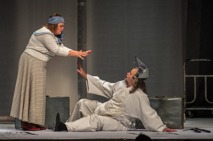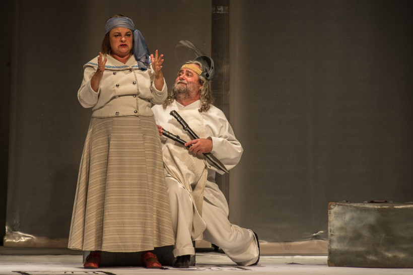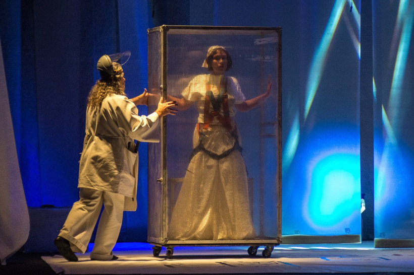 Пьеса поставлена в изящном и предельно-лаконичном жанре итальянской комедии дель арте. На сцене минимум декораций. Вернее, их совсем нет, только белые, полупрозрачные полиэтиленовые полотна, которыми принято при транспортировке оборачивать бытовую технику, свидетельствуют о потустороннем мире. По сцене туда-сюда бегают поэты, великий ученый, слуга-интеллектуал и две женщины — мама поэта и дочь химика. Причем одеты все более чем странно — Блок в наряде, очень напоминающим костюм Пьеро, да и эмоционально очень схож. Белый в костюме паяца Арлекино — этакий чудик-весельчак, изображает кентавра и учит всех героев понарошку умирать и воскресать. Маменька и вовсе одета, как городская сумасшедшая. А белый наряд Прекрасной Дамы Любы Менделеевой стилизован под форму летчика эпохи первой мировой войны.