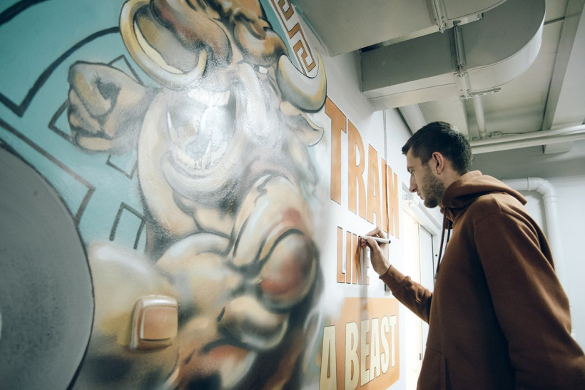 Особое внимание не только функциональному наполнению будущего зала, но и его оформлению. Помещение стилизовано под античную Грецию. Есть здесь и Зевс, метающий молнии, и Минотавр с гантелей. Художник Роман Тарабаров, который вносит последние штрихи в оформление, признался, что перед работой ему даже пришлось познакомиться с греческими мифами. «Все очень логично в этом зале, — провел небольшую экскурсию художник. — Например, на стенах кардиозоны, где будут установлены беговые дорожки, изображены античные бегуны-олимпийцы и Зевс с надписью: «Быстрее, чем молния». Думаю, что я сам запишусь в этот зал, когда он начнет работать».