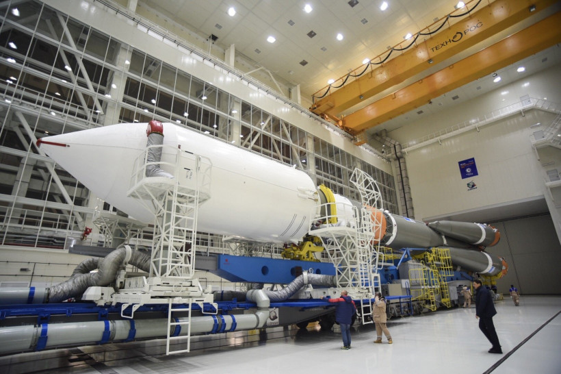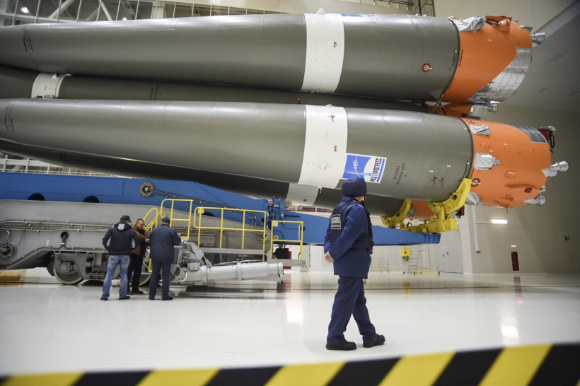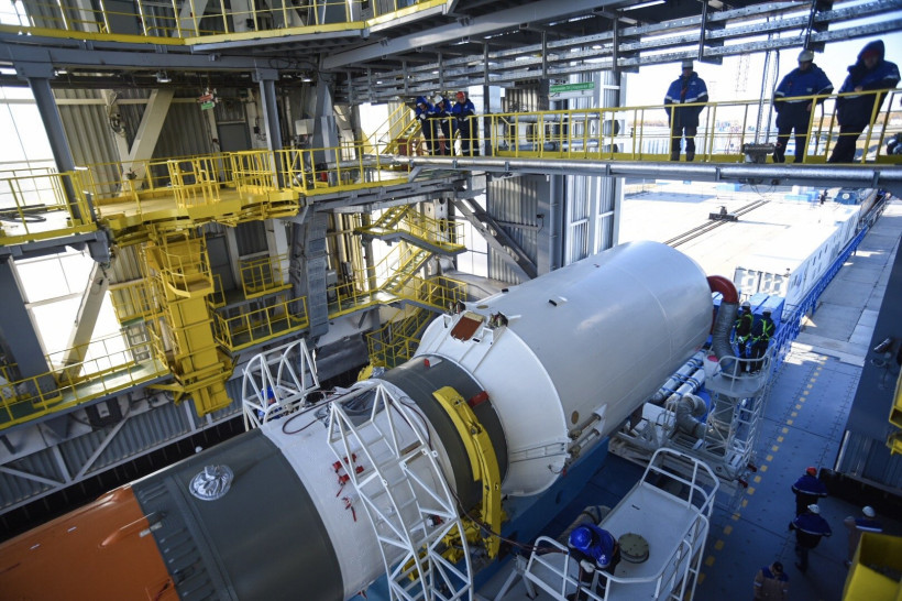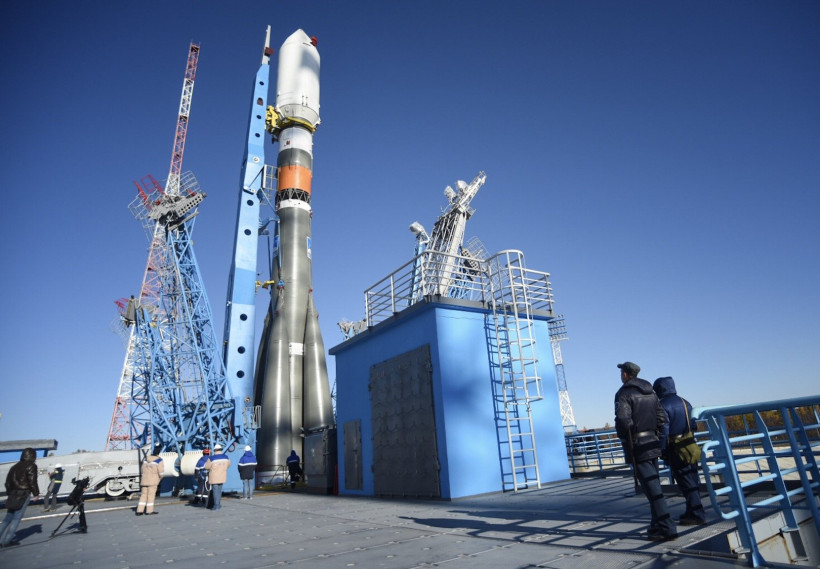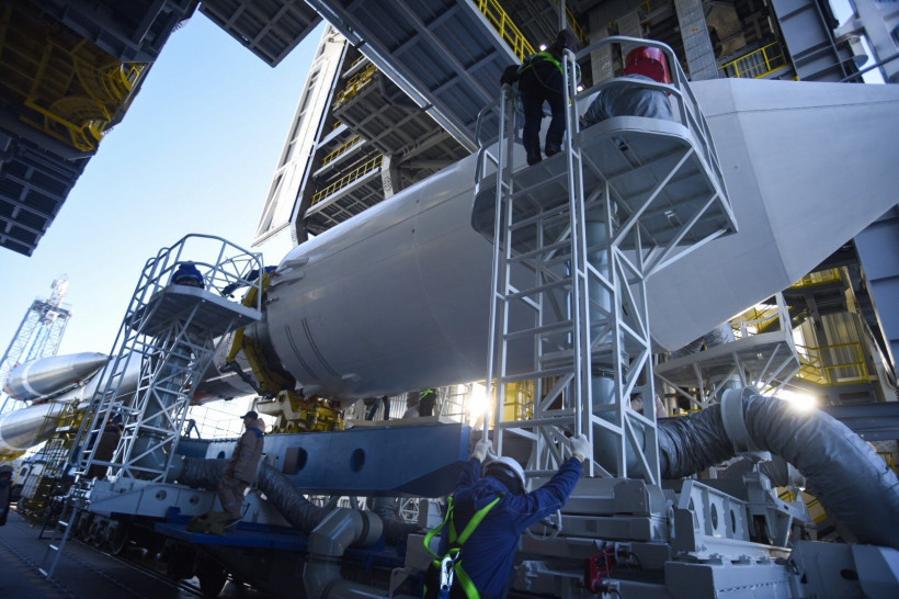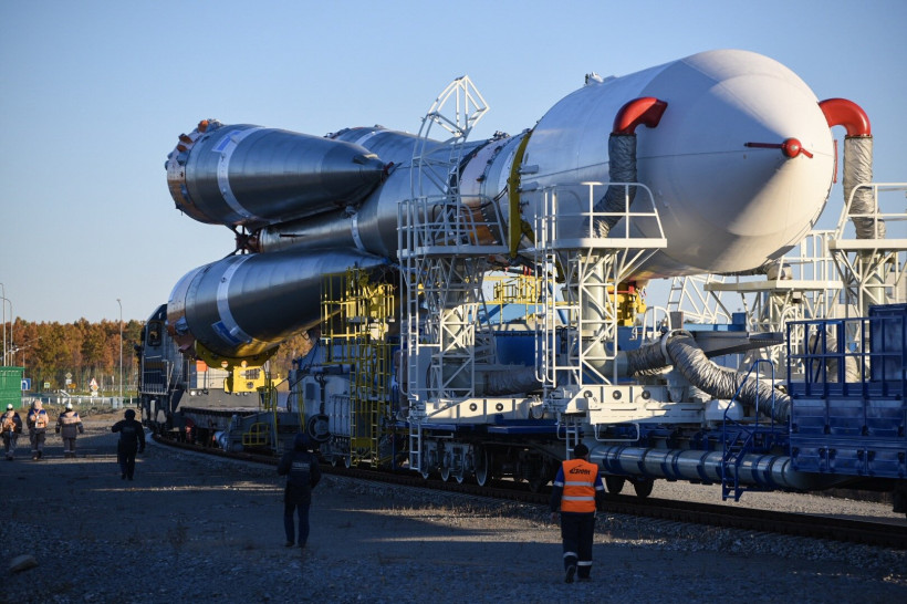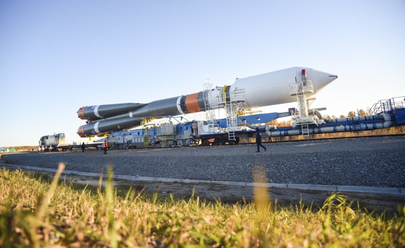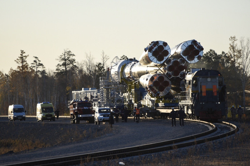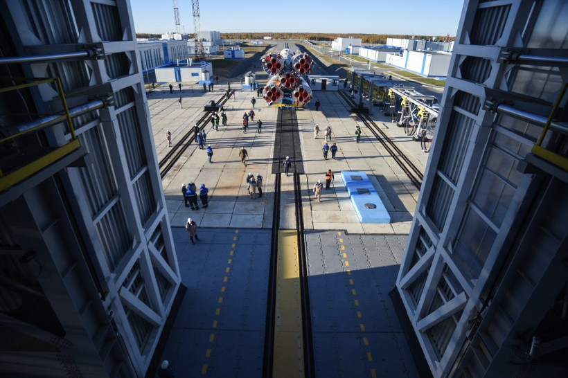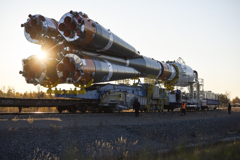 Из ворот монтажно-испытательного комплекса космодрома тепловоз с ракетой-носителем (РН) выехал на стартовую площадку на рассвете — в 6 часов. Локомотив двигался настолько медленно, что два десятка людей из бригады сопровождения попросту шли рядом с ним. Вместе с ракетой им пришлось прогуляться на 4,5 километра — таково расстояние от монтажно-испытательного корпуса до стартового сооружения. На транспортировку «Союза» ушло больше часа. Еще больше времени потребовалось, чтобы привести ракету в вертикальное положение.
