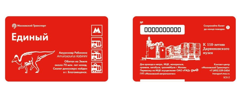 Тематические карты общим тиражом в 600 тысяч экземпляров выпущены к 110-летию Дарвиновского музея, сообщается на официальном сайте мэра Москвы. Изображение амурозавра украсило лицевую сторону билета, а здание самого музея — оборотную.