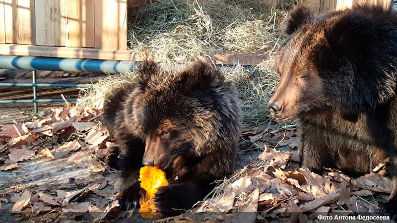 Медведи-сироты Миша и Маша с разъезда Улагир едят тыкву в сафари-парке (видео)