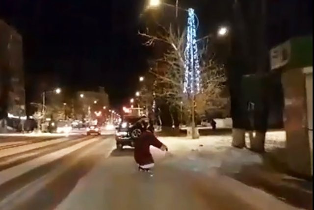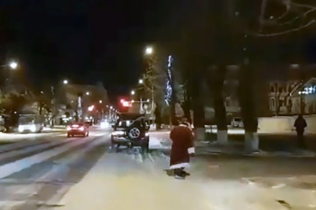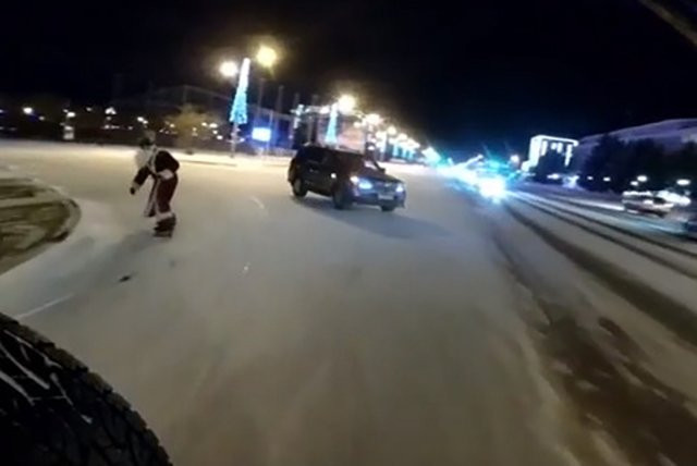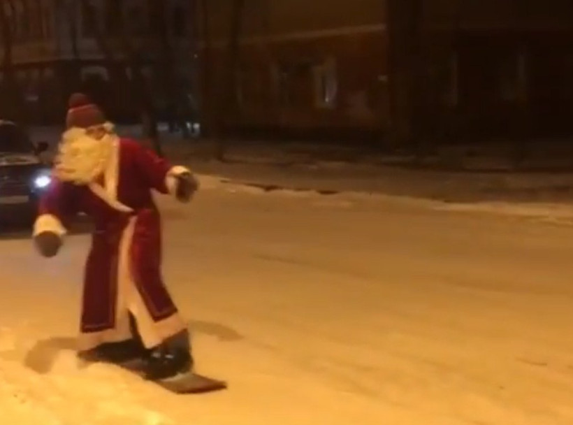 Благовещенец в костюме Деда Мороза проехал на сноуборде по центру города (видео)