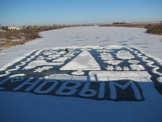 В Маркове пенсионер нарисовал на реке гигантскую новогоднюю открытку