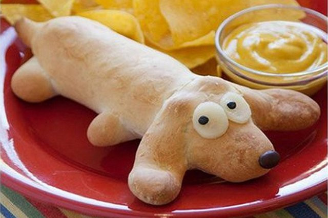 Отвариваем сосиски. Из теста раскатаем два прямоугольника в два раза длиннее сосисок. И один — немного меньше, на уши и лапки. Большие прямоугольники смажем кетчупом, положим на них сосиски и залепим края. Из одного конца теста сформируем головы, из другого — хвостики. Оливки (нос) и горошинки (глазки) тщательно углубим в тесто. На головы прикрепим ушки, а по бокам туловищ — лапки. Смажем хот-дожки сверху оливковым маслом и поставим в духовку, нагретую до 200 град., минут на 10—15.