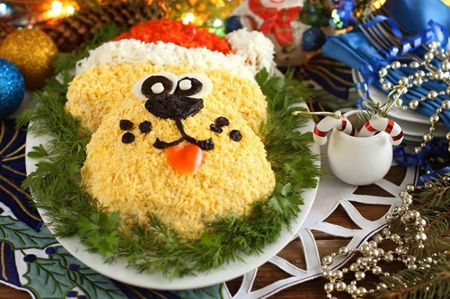 Забавное меню к праздникуВ прошлый Новый год, желая не рассердить его хозяина, мы избегали подавать на праздничный стол курочку. Но в год Собаки эти правила не работают, Собака все же не звено пищевой цепочки. У наших четвероногих друзей достаточно чувства юмора, чтобы не обидеться на тортик или салатик в форме собачьей мордочки.