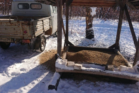 Кабанов зерном безвозмездно подкармливает местный фермер Алексей Черных. «Мы уже вывезли более двенадцати тонн отходов зерновых и сои. Еще двадцать тонн подсыплем до марта, — уточняют лесные повара-охотоведы. — Чем выше за окном мороз, тем чаще подсыпаем».