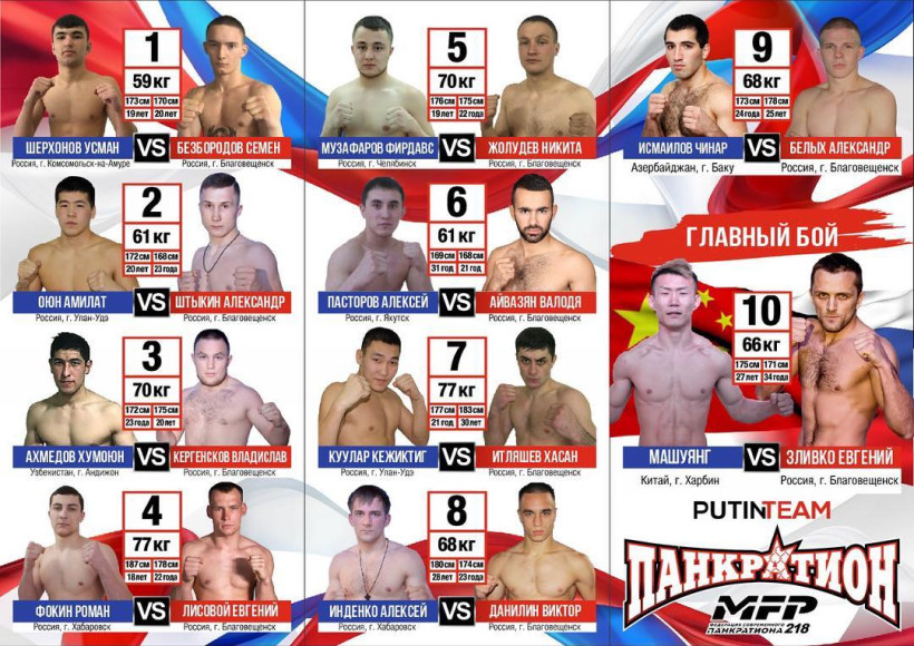 Всего во время турнира пройдут 10 поединков, в каждом из которых выступят амурчане. Команду Благовещенска к состязаниям помогал готовить бразильский боец Алисон Маркес.